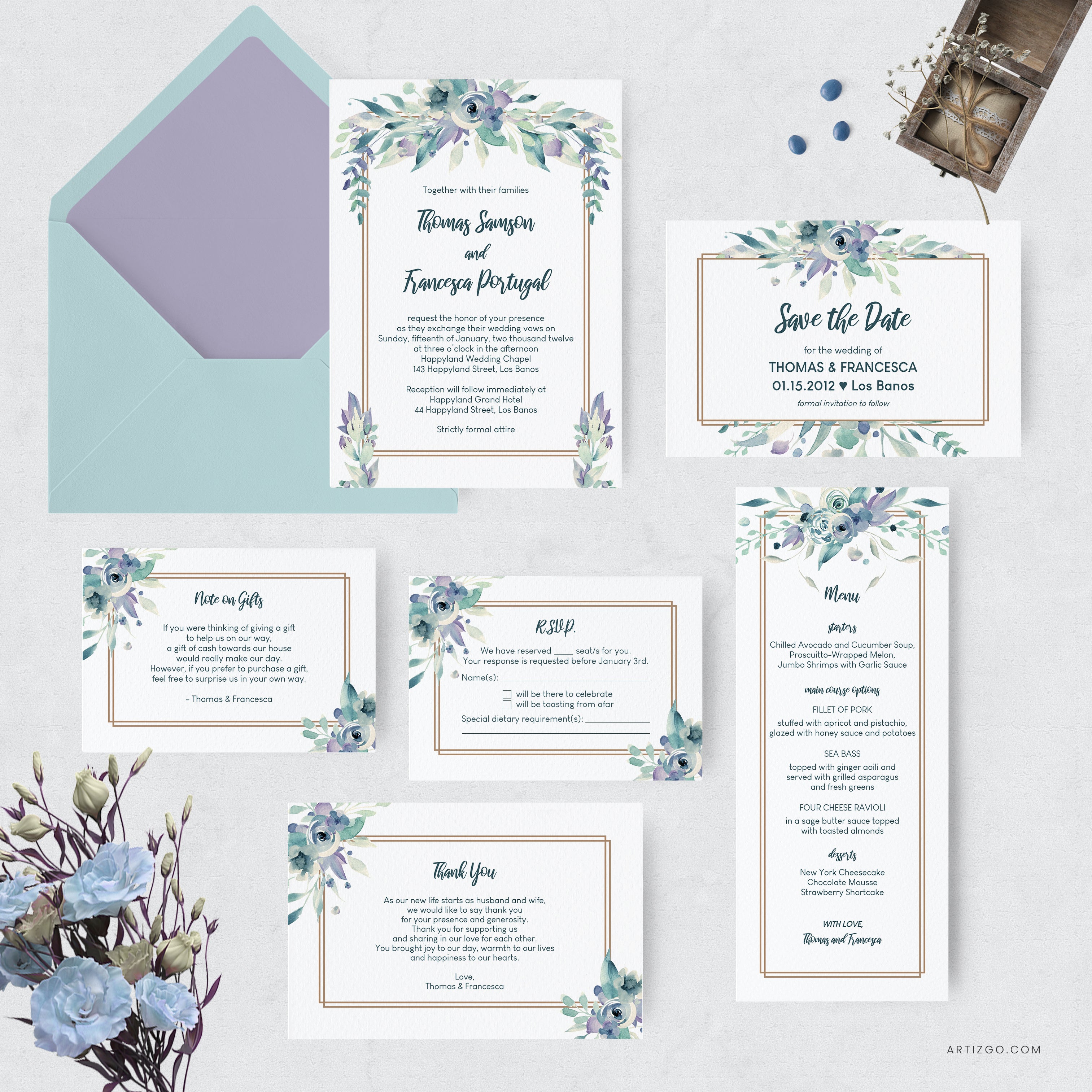 The Soft Summer Blooms Printable Wedding Invitation Bundle is a complete, editable wedding stationery set designed for couples planning a garden, spring, or summer wedding. This elegant floral invitation suite features soft watercolor blooms in blue and lavender tones, paired with clean typography and subtle line accents for a light, romantic look.